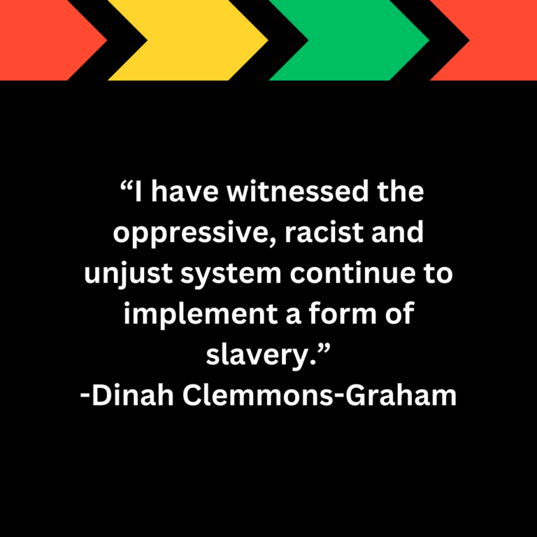 Dinah: I have witnessed this oppressive, racist and unjust system continue to implement a form of slavery. If you don’t do as I say, I will disrupt your family by separation. There is more empathy when it involves white people, which is very rare.