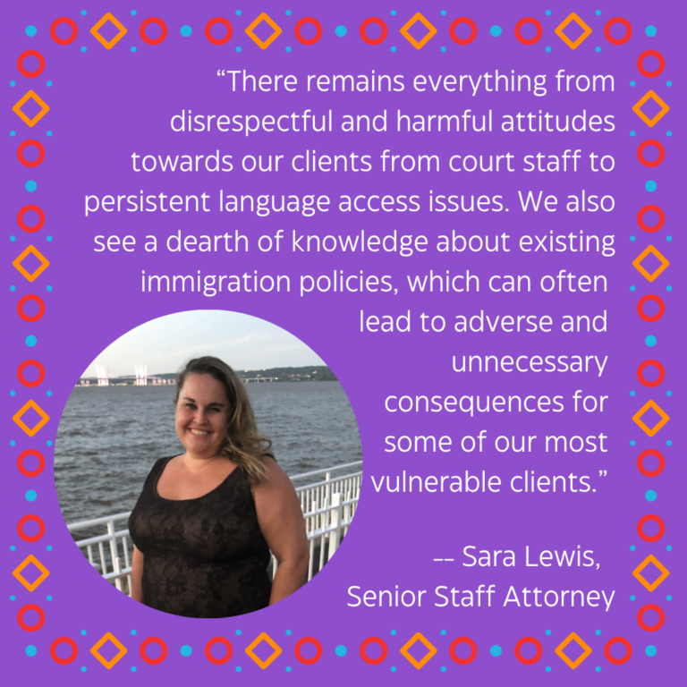 Sara: For me, it was apparent from the moment you walked into the courtroom, realizing how disproportionately Black and Brown families are targeted by, not just ACS, but all the government systems around them that are purporting to help. There remains everything from disrespectful and harmful attitudes towards our clients from court staff to persistent language access issues. Especially with our influx of clients who are new to the United States, we also see a dearth of knowledge about existing immigration policies, which can often lead to adverse and unnecessary consequences for some of our most vulnerable clients.