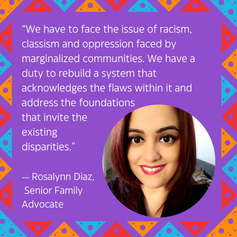 Rosalynn: We have to face the issue of racism, classism and oppression faced by marginalized communities. We have a duty to rebuild a system that acknowledges the flaws within it and address the foundations that invite the existing disparities. I have witnessed parents being treated with an inexcusable lack of empathy and disregard for their families.