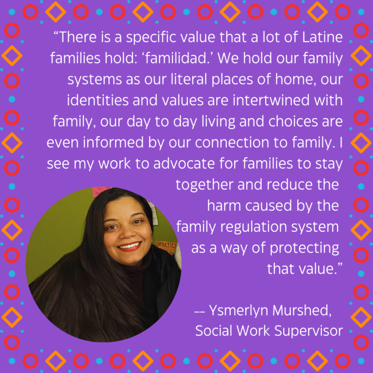 Ysmerlyn: There is a specific value that a lot of Latine families hold: “familidad.” We hold our family systems as our literal places of home, our identities and values are intertwined with family, our day to day living and choices are even informed by our connection to family. I see my work to advocate for families to stay together and reduce the harm caused by the family regulation system as a way of protecting that value.